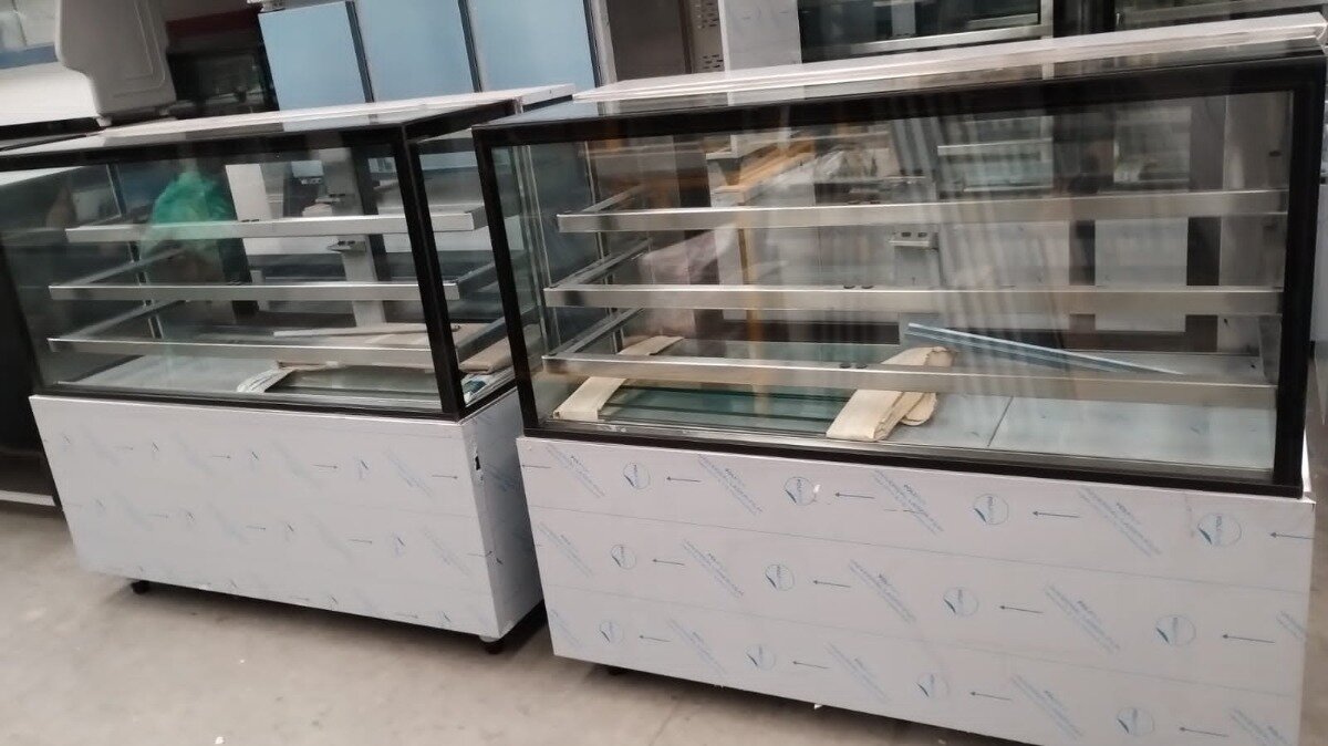 Exhibidora refrigerada para la exhibición de postres, tortas, sándwich, pastas, sushi, etc. Realizada íntegramente en acero inoxidable esmerilado. Aislación en poliestireno expandido de alta densidad 40 kg/m3. Cúpula recta panorámica de cristal termopanel. Dos estantes y piso. Acceso: trasero, por medio de puertas corredizas. Rango de temperatura: 2ºC / 8ºC. Digital de temperatura. Equipadas con una unidad condensadora de 1/2 hp, conexión incorporada. Alimentación eléctrica 220v. Medidas: 1500 mm de frente * 700 mm de profundidad * 1330 mm de altura.