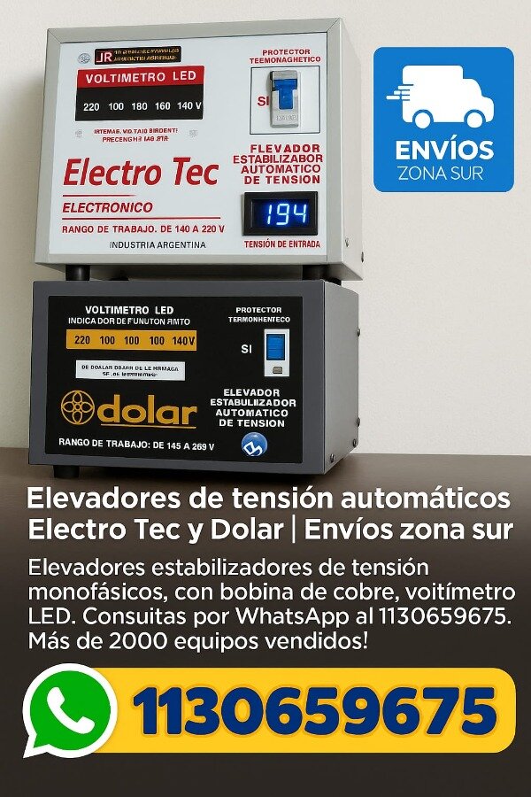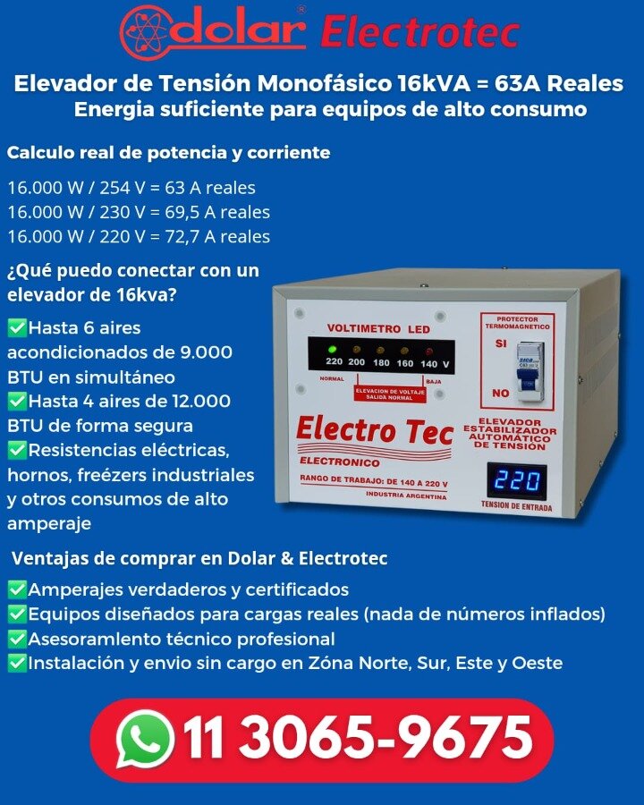 En **Dólar & Electrotec** fabricamos estabilizadores de tensión **monofásicos de 16 kVA reales (63 Amperes efectivos)** . A diferencia de lo que muchos publican en Mercado Libre, nuestros cálculos son verdaderos, sin potencias infladas ni promesas falsas. La famosa **garantía de 5 años** que otros ofrecen es un engaño ❌: siempre terminan culpando al cliente. Nosotros brindamos **garantía real**, con respaldo técnico, entregas a domicilio **sin cargo** e **instalación gratuita hecha por profesionales** de nuestra empresa ️. Este modelo es ideal para la **Zona Sur**: Avellaneda, Quilmes, Berazategui, Lomas de Zamora, Lanús, Florencio Varela y alrededores. Con nuestros equipos tenés **seguridad eléctrica, potencia verdadera y tranquilidad asegurada** ⚡.
