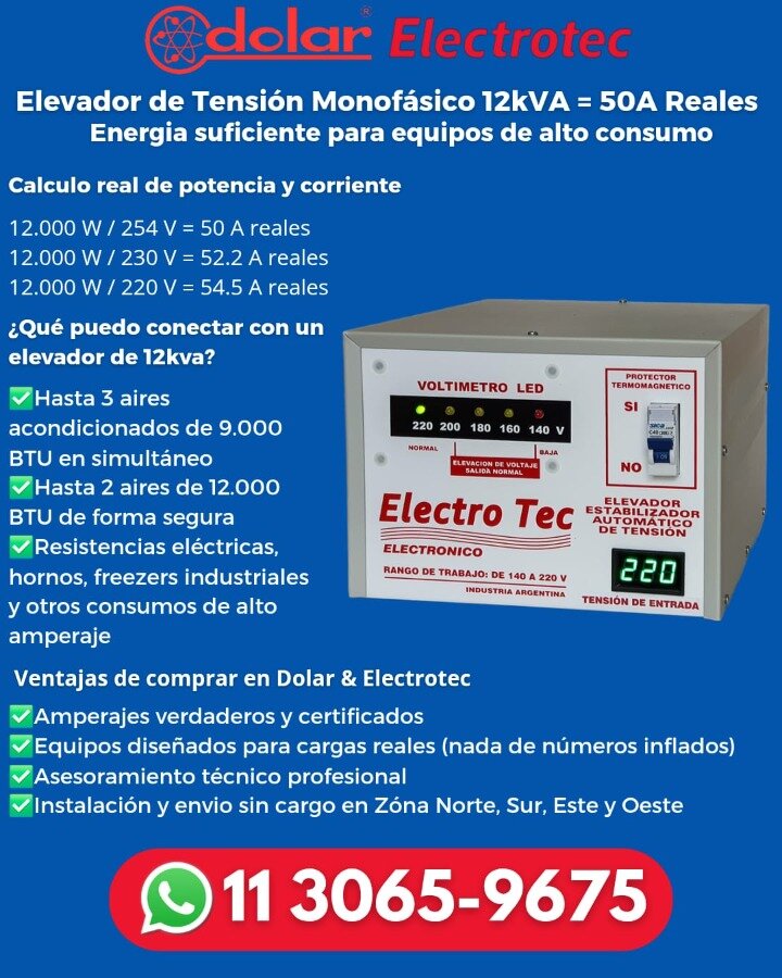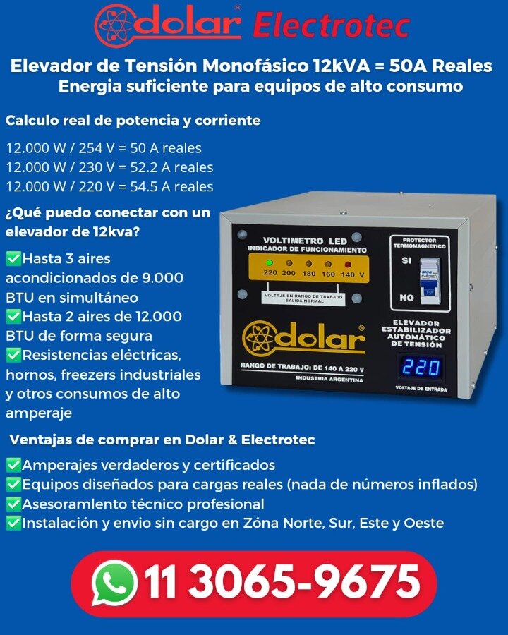 El elevador de tensión de 12 kVA – 50A reales – 12.000W continuos de Dólar & Electrotec es la solución ideal para hogares y comercios que requieren un consumo medio-alto de energía, brindando estabilidad eléctrica y potencia comprobada ⚡. A diferencia de lo que se publica en muchos portales como Mercado Libre, donde los vendedores inflan los números y confunden al usuario diciendo que estos equipos no sirven para estufas, termotanques o electrodomésticos de alto consumo ❌, nuestros cálculos son transparentes y basados en fórmulas reales. Un estabilizador de tensión monofásico de 12 kVA entrega verdaderos 50 amperes efectivos, lo que permite alimentar hasta 4 aires acondicionados, heladeras, bombas de agua, lavarropas y microondas sin riesgo de caídas de voltaje ni sobrecargas.
